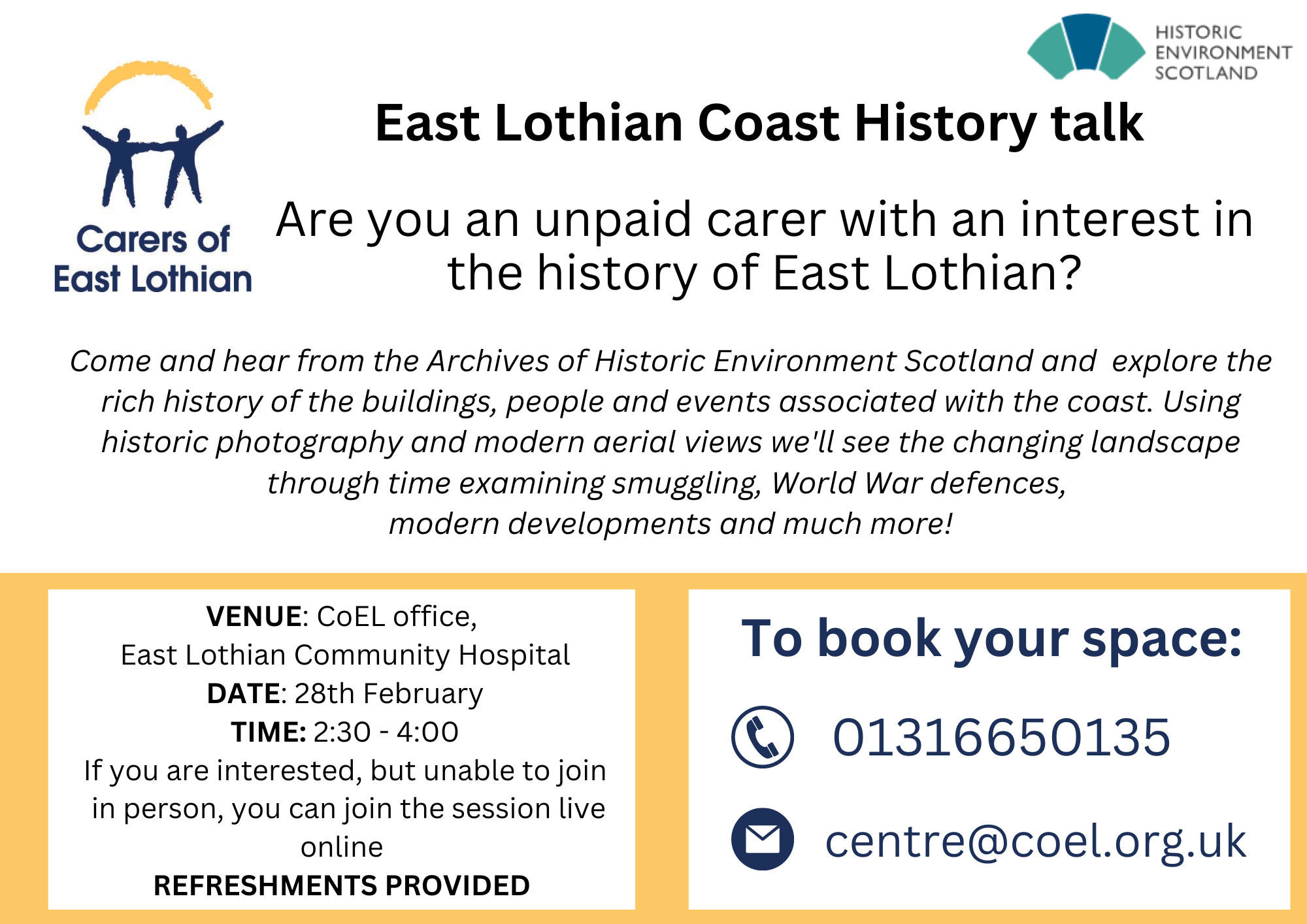 We are very excited to be joined by Neil Fraser from Historic Environment Scotland who will be sharing with us from HES Archives. Join us to hear about the rich history of East Lothian. See the flyer below for details of how to book your space on this session.