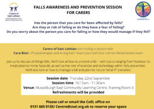 Carers of East Lothian are holding a session with Cara Blair – Physiotherapist and Acting Falls Team Lead with East Lothian Rehabilitation team on 22nd September at 10:15am at Musselburgh East Community Learning Centre.