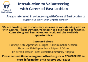 At Carers of East Lothian we have a variety of Volunteering opportunities available. Are you interested in volunteering to support the work that we do with unpaid carers? If so, our Volunteer and Training Coordinator, Gemma Twells-Davison is holding two introductory sessions for prospective volunteers. Come along to hear more about what we do as a service and how you can get involved.