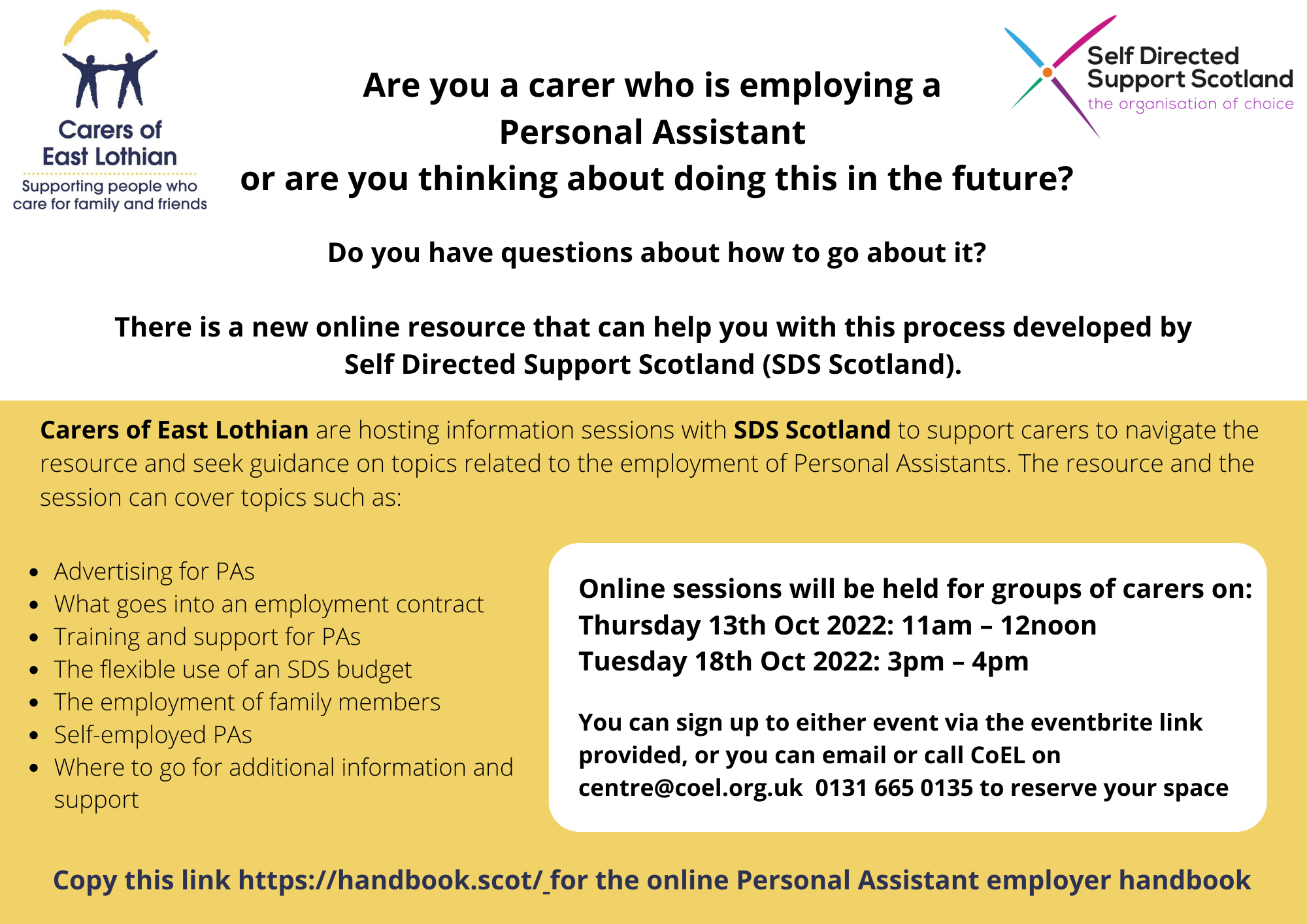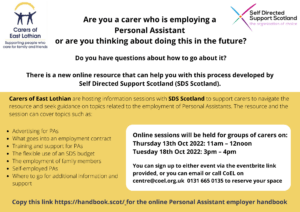 Carers of East Lothian are holding two online sessions with Mark Han-Johnston from Self Directed Support Scotland to support carers who are employing a Personal Assistant or those who are thinking of doing so in the future.
