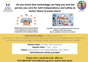 Carers of East Lothian are holding a session with Joyce Wilson, TEC Officer. Joyce will bring devices along for you to have a look at and try and can answer questions that you may have.