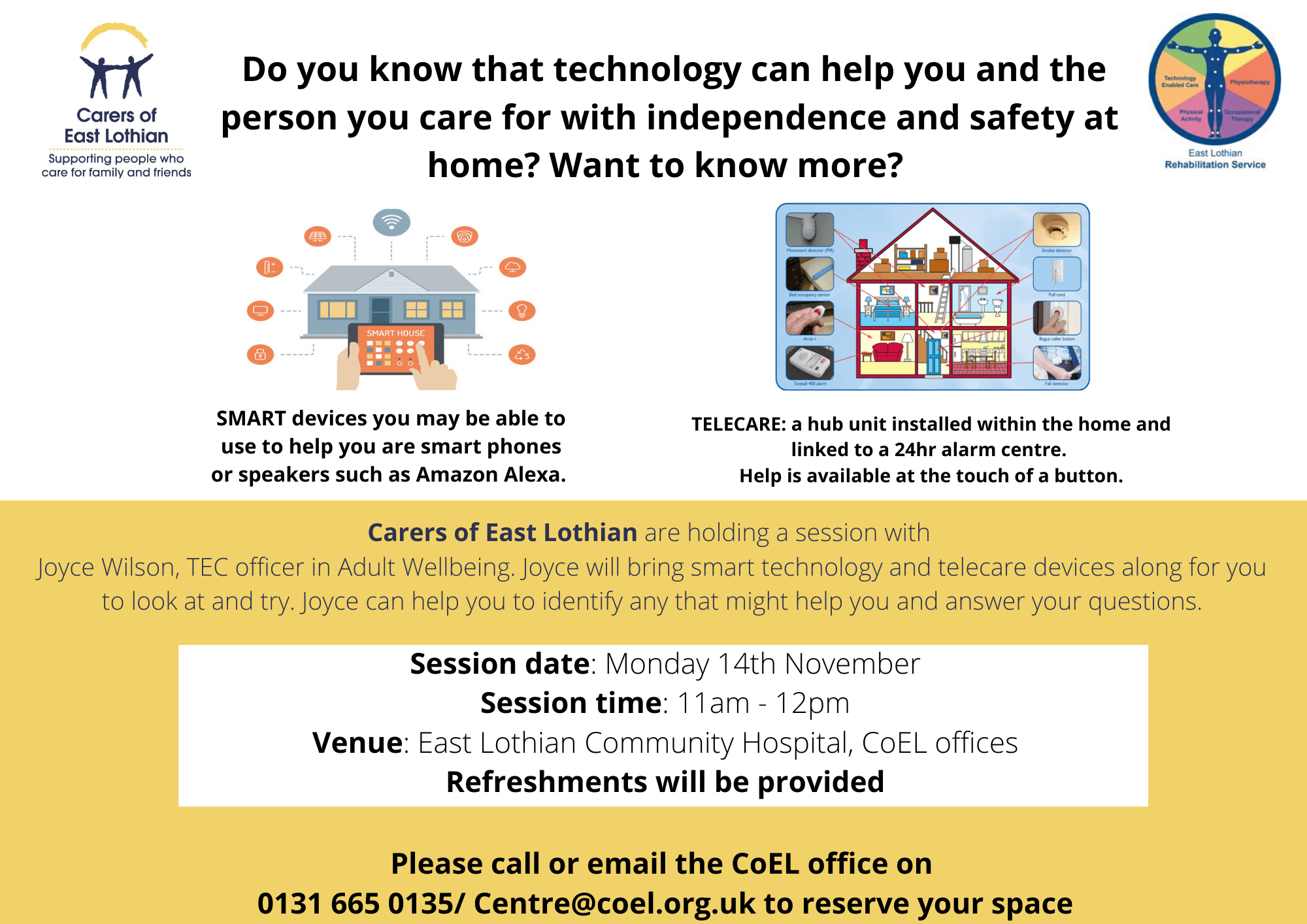 If you would like to know more about how technology can support you and the person you care for to stay safe and independent at home, here are details of an upcoming session that could help you.